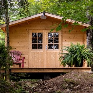 Installation: Most clients (80%) enjoy building their bunkies themselves – we provide easy to follow installation manuals and video aid. See stories of happy clients building their bunkies. If you would prefer to have your bunkie installed, we recommend a local contractor, landscape or decking company or contact us for a list of contractors who have installed bunkies for other clients. You will need to add a foundation, metal or shingle roofing, and stain.